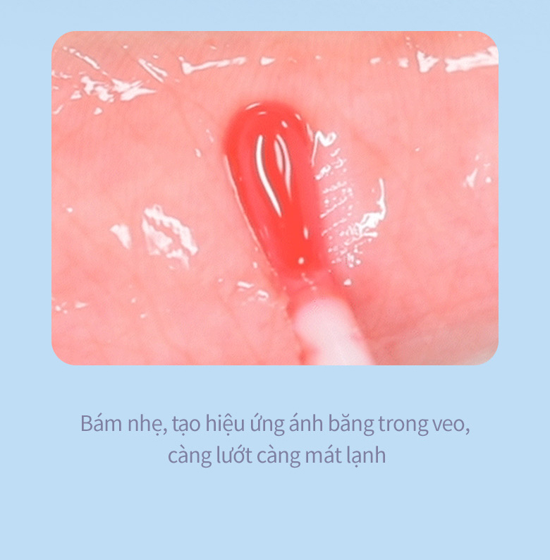 - Công thức nước mát lạnh như băng tan, thấm đều, cho đôi môi ẩm mượt và thoải mái, không bết dính.